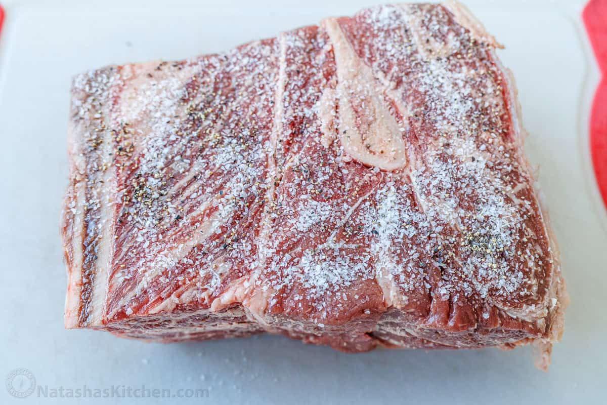 - Prepare the Roast – Generously season the roast with 3 tsp salt and 1 tsp pepper on all sides and leave uncovered at room temperature for 1 hour to bring to room temperature for more even cooking. Set the rack in the lower third of the oven and preheat your oven to 325˚F.